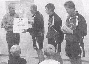 Unterspiesheim ist ein Stützpunkt von 64 in Bayern und 390 in der Bundesrepublik. Im Kreis Schweinfurt gibt es jetzt drei Zentren zur Talentförderung. In dieses Projekt fließen jährlich zehn Millionen Euro. Damit unterstützt der DFB die Stützpunkte und 1170 Trainer, die etwa 22 000 junge Fußballbegabte im Alter von elf bis siebzehn Jahren fördern. In Unterspiesheim werden zwei Gruppen trainiert. 30 Fußballer des Geburtsjahrgänge 1985 bis 1989 (von 17 bis 1830 Uhr) und 22 Fußballer der Jahrgänge 1990 und 1991 (1830 bis 20 Uhr) bekommen etwa 35 Trainingseinheiten im Jahr. Rudi Baumann führte die Vorteile des Talent-Förderprogramms aus. Die Stützpunkttrainer werden sich intensiv mit den einzelnen Spielern beschäftigen. Das Ziel ist es, die Kinder und Jugendliche in dem Alter, in dem sie am schnellsten Lernen, auf spielerische Art zu schulen. Der DFB möchte talentierten Spielerinnen und Spieler durch ein qualitativ hochwertiges Training und fachlich geschulten Trainer frühzeitig sichten und gezielt ausbilden. Dies geschehe als Ergänzung zum Vereinstraining und führe zur Heranbildung technisch versierter und taktisch gut spielenden Fußballern. Kurt Vollmuth erklärte, dass eine gute Zusammenarbeit mit den örtlichen Vereinen und deren Jugendtrainer ihr Bestreben sei. Somit sind kurze Wege zwischen Verein, Landesverband und DFB gegeben. Die Auswahl der Talente erfolgt an den Sichtungstagen, bei denen jeder Verein Fußballer der entsprechenden Jahrgänge anmelden könne. MdB Frank Hofmann betonte, dass er es für wichtig halte, Fußballförderung auch auf dem Lande durchzuführen, da auch etliche Profifußballer vom Lande kämen. Er forderte die Jungfußballer auf: "Hängt Euch rein" und wünschte den Kindern viel Spaß und viel Erfolg. Bürgermeister Horst Herbert, brachte seine Freude über einen DFB-Stützpunkt in der Gemeinde zum Ausdruck und erhofft sich für alle Fußballvereine der Ortsteile einen Motivationsschub. |