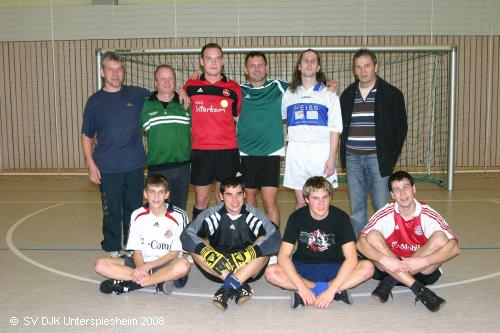 Schon zum siebten Mal trug der SV DJK Unterspiesheim ihre „Spiesheimer Hallenfußball-Dorfmeisterschaft“ aus. Alle ab 15 konnten an diesem Spaßturnier teilnehmen. Die „Turbobande“ holte sich den Titel noch vor der Mannschaft „Irgendwas“, die sie beim Finalspiel mit 2:1 Toren schlugen. Das Spiel um den dritten Platz entschied „Aggro Unterspiesheim“ klar gegen den „Golden Girls“ mit 4:2 Toren. Den fünften Platz belegten die „Flippers“, den sechsten das Team „Rußpartikel“, den siebten der „FSG Oberspiesheim“ und den achten „Pekingente Süß Sauer“. Der beste Torschütze war Andreas Brendler mit sechs Treffern. Die Organisatoren Volker Erich und Markus Ebert sowie die Turnierleitung Jochen Brand und Reinhold Heim zeigten sich sehr zufrieden mit dem fairen Verlauf der Meisterschaft, bei der der Spiel und Sport im Vordergrund standen. Der Kassier der DJK, Reinhard Kraus, nahm die Siegerehrung vor und bedankte sich bei den zahlreichen Besuchern und Helfern des Turniers. |