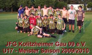 Die U17, trainiert von Dieter Krauß und Klaus Hertlein konnte in der Gruppe Schweinfurt 2 am letzten Spieltag gegen den TSV Grafenrheinfeld die Meisterschaft sichern. In der ersten Halbzeit war die Nervosität der Jugendspieler zu erkennen, die vor den 80 anwesenden Zuschauern nicht zu ihrer gewohnten Form aufspielen konnten. Erst als in der 60 Spielminute der Spielführer der Mannschaft Moritz Nunn das erlösende 1:0 erzielte, war der Bann gebrochen und in den nun folgenden Spielszenen konnte man das gewohnte gute Kombinationsspiel erkennen und es fielen folgerichtig noch zwei weitere Tore zum verdienten Endstand von 3:0. Download vom Meisterfoto (Dateigröße 1855 KByte)