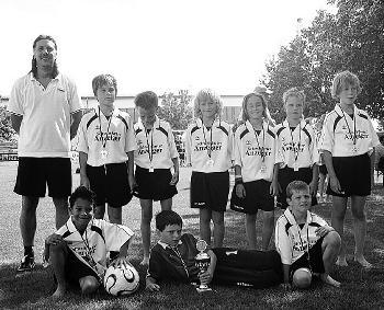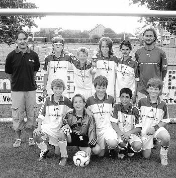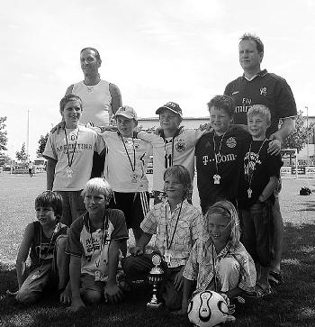 In der Gruppe U11-E2 gewann die Jugend des FC 05 Schweinfurt beim Masters-Turnier in Unterspiesheim. Im Bild, hinten (von links) Herr Tröppner (Kreissparkasse), Nico Vorndran, Manuel Schwab, Christos Papadimitriou, Ömer-Faruk Yegen, Trainer Bernd Lehfer. Vorne: Alp Yigit, Felix Lehfer, Stefan Denner und Pascal Heimrich. |
