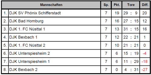 Spielen stand der Sieger fest. Ungeschlagen und mit nur einem Unentschieden gegen die DJK Nüsttal 1 gewann der DJK SV Phönix Schifferstadt die DJK