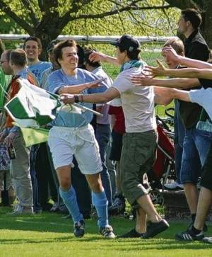![]() Viele Hände reckten sich ihm entgegen: Nach seinem vorentscheidenden 4:1 gegen die DJK Schweinfurt ließ sich Unterspiesheims Andreas Brendler (links) von den Fans feiern. Foto: Mainpost / Volker Hensel |