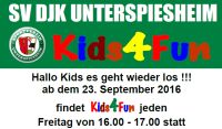 Mit Kids4Fun wollen wir unsere jüngsten Mitglieder spielerisch an den Vereins- und Mannschaftssport heranbringen. Hier geht es noch nicht um Leistung, sondern um Spaß am Sport und in der Gemeinschaft. Die Kinder lernen unter Anleitung der Betreuer, sich in einer Gruppe zu integrieren und sollen so langsam an den Sport herangeführt werden. Ob Junge oder Mädchen, alle sind hier willkommen, um ihre persönlichen Neigungen auszuloten um dann in den jeweiligen Abteilungen der DJK Unterspiesheim IHRE Sportart zu finden.