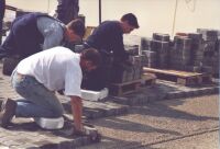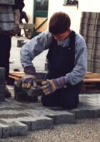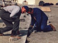 Betonsteinpflaster verlegt und die Ablaufrinnen und Randsteine gesetzt. An den